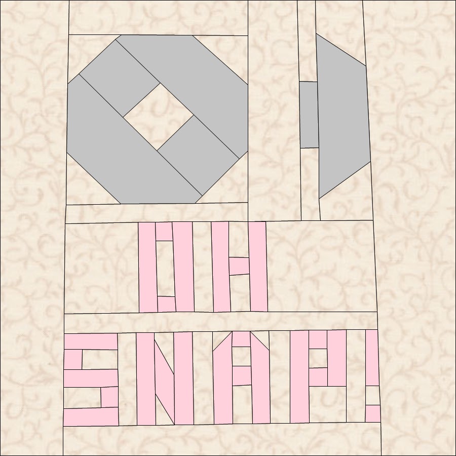 Attach section N to bottom of word SNAP. Then attach section O to top of SNAP. Then attach "OH" section to top of SNAP. Then attach sections ABC above OH SNAP words as shown in piecing diagram.