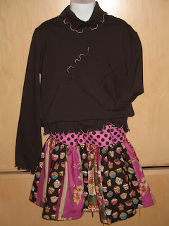 Attempt 2 is a plain brown turtleneck spiced up with pink lettuce edging (another Ottobre Designs pattern). The turtleneck matches my new cupcake twirl skirt design. This top is made of cotton lycra and is very stretchy thus delivering a very nice lettuce edge. Used a wooly nylon thread here to really fill out the stitches and show off the pink contrast stitching.