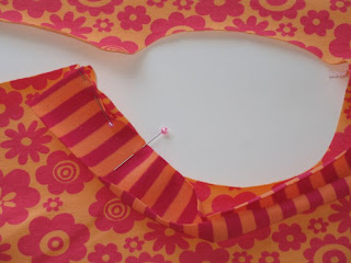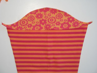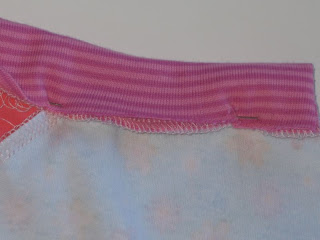 3. Sew the neckline band piece to the neck opening. Note that when you cut this piece, the instructions don't really tell you exactly how long to cut the neckband. I think it gives a range of between 25.5-35.5" (65-90 cm). Just make sure it is long enough to cover the neckline and you want to cut it across the grain of the ribbing so that it has maximum stretch. I sewed this onto the front, right sides facing.