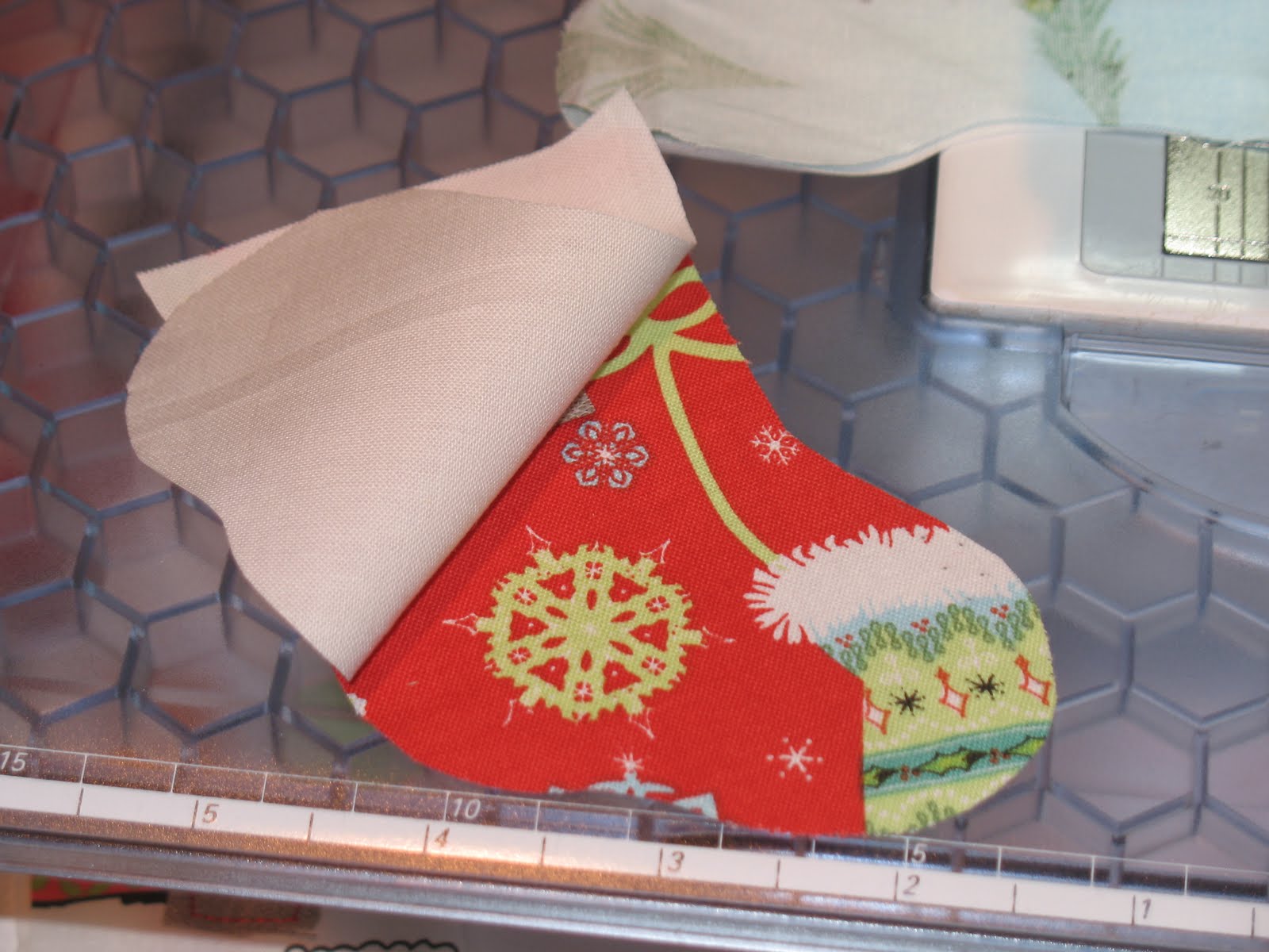 I traced the stocking onto a piece of plastic quilting template then cut it out. You can find this plastic at any place you buy quilting supplies. However, you can also use a piece of paperboard or cardboard, or even cut it out of a plastic lid. Whatever, works for you.